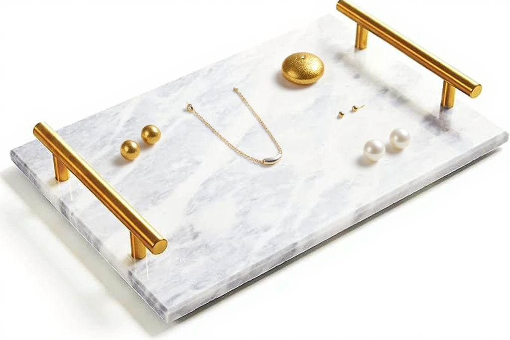 Decorative Tray, Gold Metal Handle with Genuine Marble, Handmade Vanity Tray, Perfume Cosmetic Tray for Dresser Bathroom Vanity Table